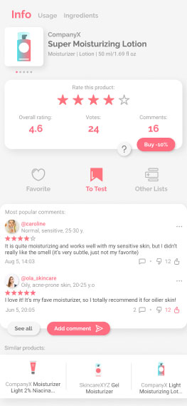 Explore products via our app - read structured reviews, see what others use in their routines, create and share product lists, mark products as favorites or add them to a wishlist.